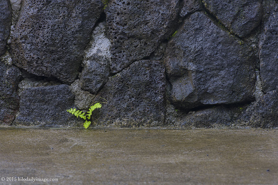 I can't let that fern get a foothold in the wall -- not to mention letting whatever tendril of whatever other plant is getting started along in there get its own foothold -- but I'm letting it go today because the green against the lava is nice.