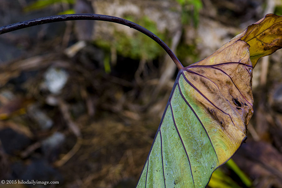 Here's an ornamental taro (kalo) leaf. I've offered these leaves before, including from the side, but I grabbed this one because of the color variation. The earlier one was in a different part of the yard, for what that's worth.