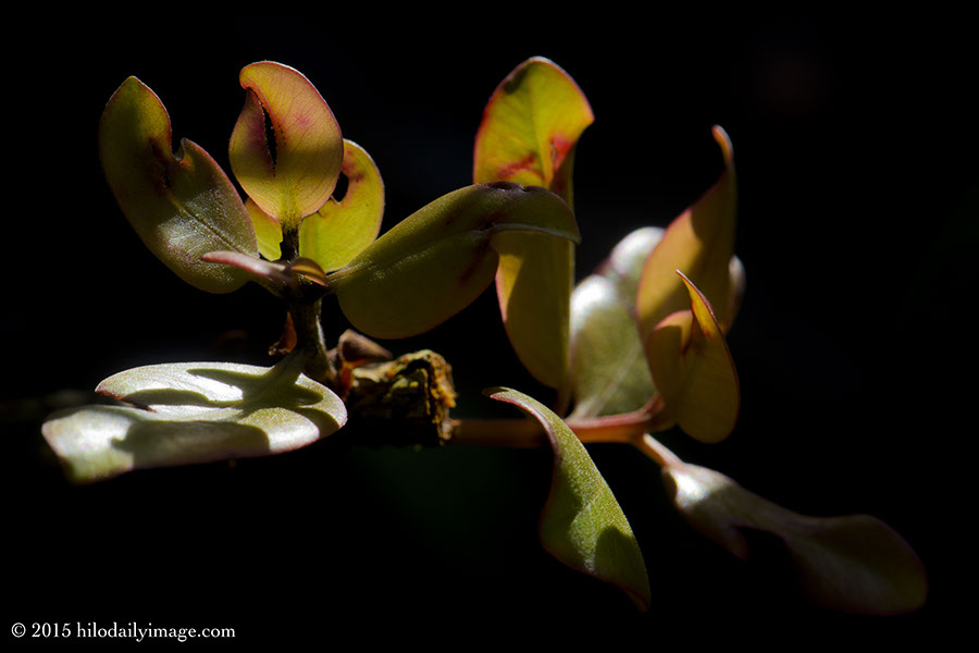 Then, as I passed the orange 'ohi'a on the way out, I noticed a single new leaf also lit by the early sun. By the time I got set up properly more than the single leaf was lit, but I liked the shot anyway.