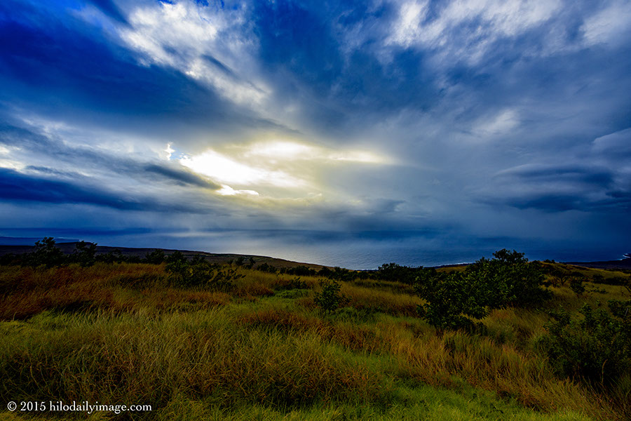 But it just wasn't working. The sun wasn't cooperating. I was disappointed (and wet, and cold). Ruth asked me to take one of her sitting and writing (which is what she'd been doing) so I took off the tele, mounted the super-wide, took a couple of her, and then realized that the super-wide was the lens of choice. So I worked with it for a few minutes, hand-held, and thus the 2015 Winter Solstice Hilo Daily Image.