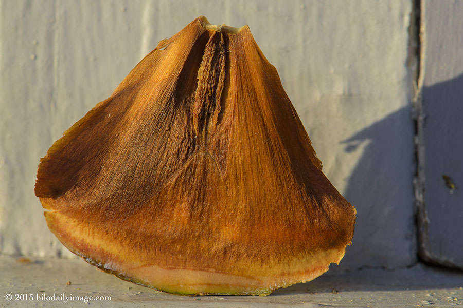 Today I'm doing the same. We have college friends visiting from the mainland, and Carla spotted one of these at Akaka Falls. I picked up one too. I don't know what it is -- maybe it's part of an conifer's cone. I'll try to find out, but in the meantime here it is, perched on a sill, lit up by morning sun.