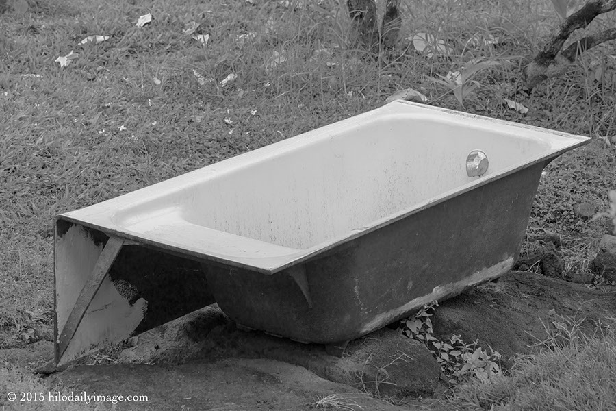 The "out with the old, in with the new" saying was in my thoughts this morning, so I decided to use the old cast-iron bathtub for the HDI. It came out of the house a couple of days ago, part of the major renovation that's happening here on Wailuku Drive.