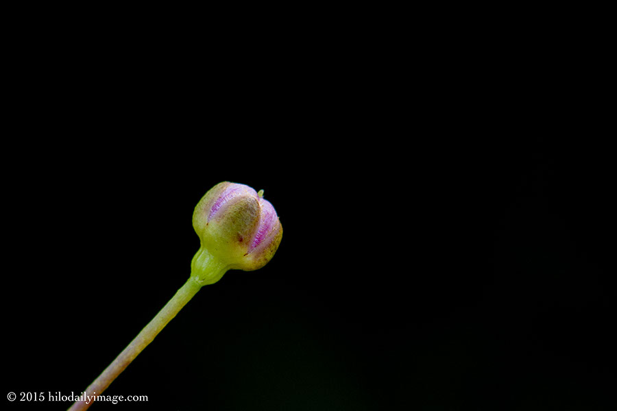 Over at the Surinam Cherry by the lava tube I spotted a white blossom that seemed promising. But how many times have I offered white blossoms as the HDI? Many times. Close to the blossom was a bud, so tiny that with my naked eye I could only see that there were streaks of color. I tried a few head-on shots, but didn't like them. So I moved around to the side, and got this one.