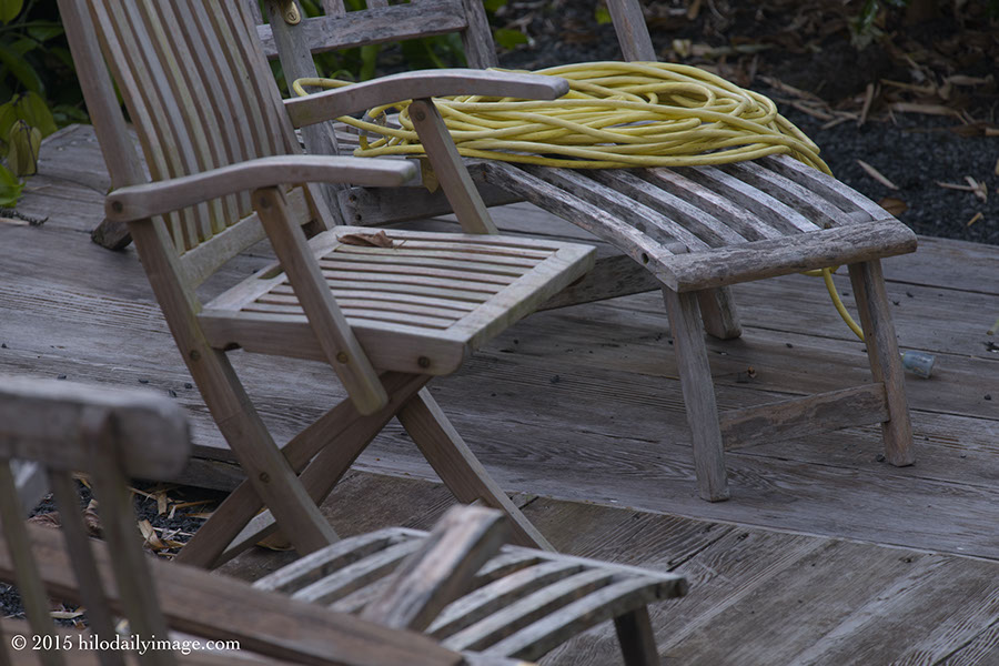 Teak chairs, yellow 12 gauge extension cord, cinders, redwood platforms, and blue jade.