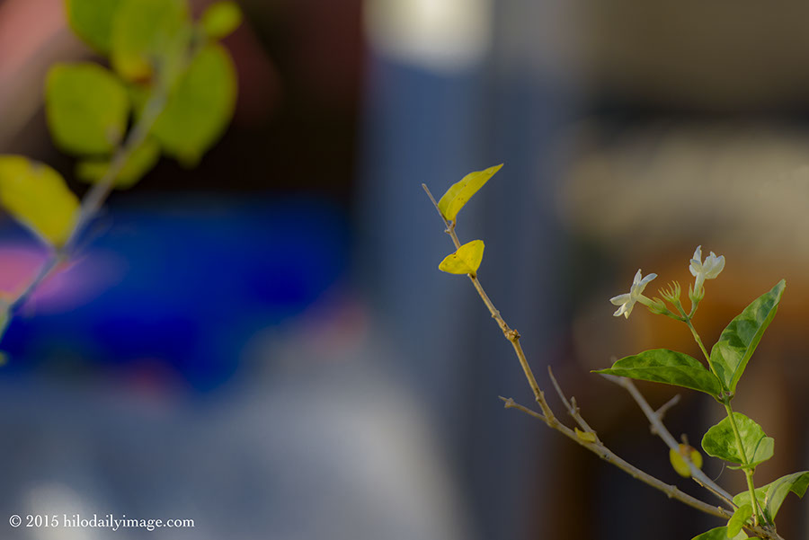 But I'll make it hard on myself by limiting myself to just the pair of pikake in the Zen garden, which are planted in the same planter and behave as one plant. I'll try to find different ways to present the pikake, and I'll try to avoid concentrating on blossoms in closeup.