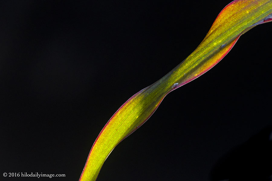 Like the anthurium bed and the white hibiscus and the blue jade, the black ti is an endless source of images. If I shoot down from the porch, the background is already dark, and it takes very little adjustment to drive it into full black. Which I like.