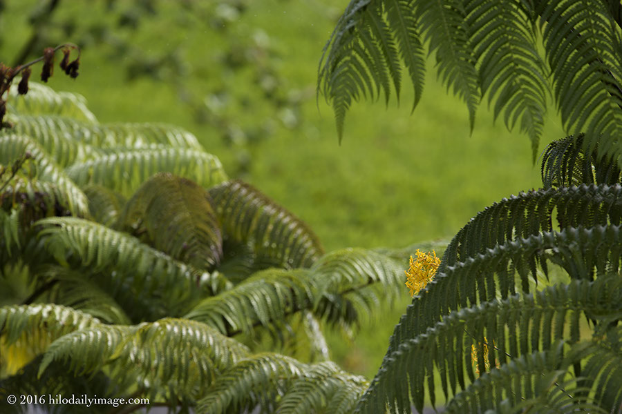 The yellow epidendrum would have made an ordinary picture from ground level, but from well above, tucked in behind a hapu'u frond, it takes on a different appearance. And the 300 mm lens lets me isolate it nicely.