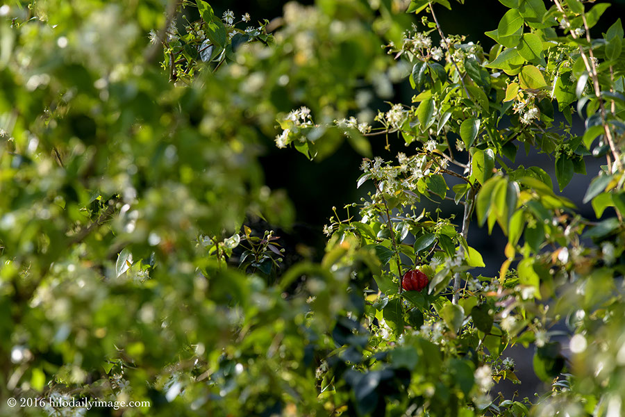 I was out on the new lanai (where else?) and saw a single new Surinam cherry in the middle of the tree and its blossoms.