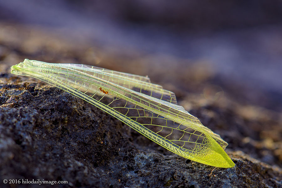 The pikake is blooming again, and a blossom blew onto the rock wall and came to rest upside down. I finished shooting it but then I saw something green farther along the wall. Insect wing, but what kind, I don't know.