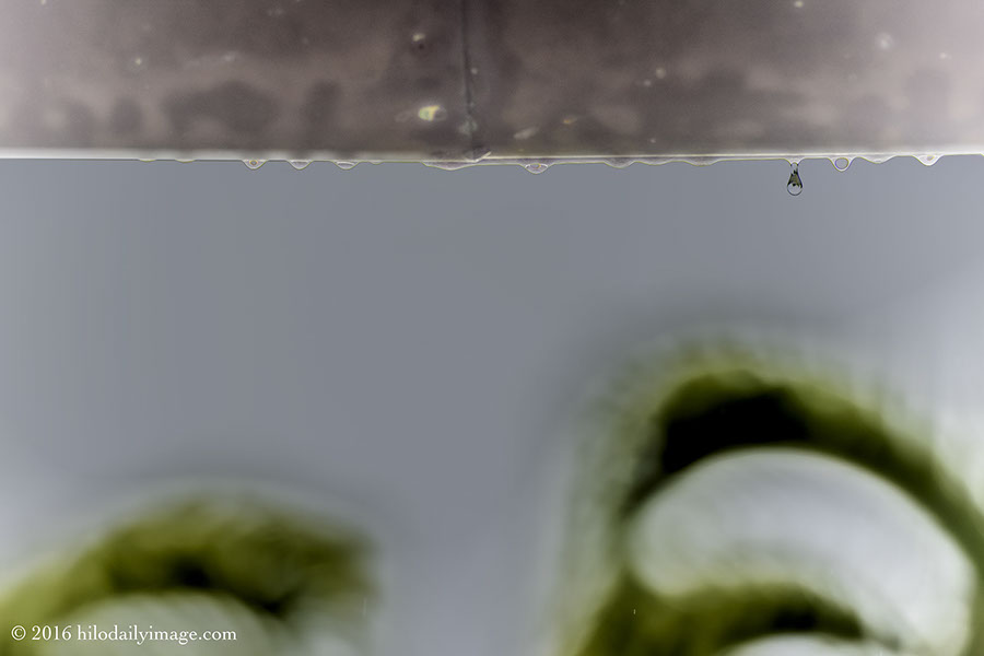 The new doors and lanais let me get close to the underside of the copper gutters, without having to point the lens nearly vertical. So here are raindrops, one falling, and the Walsh's Areca palm both out of focus at the bottom, and in-focus in the raindrop.