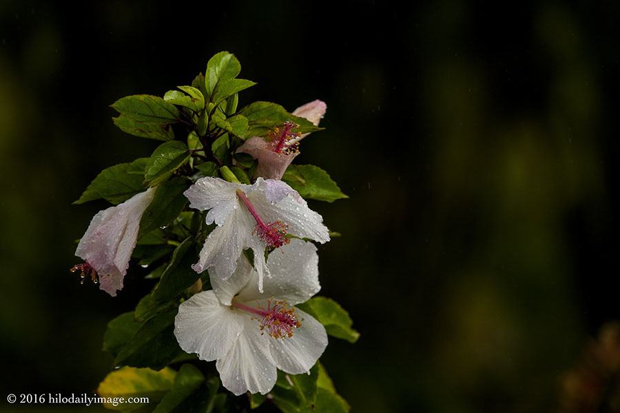White hibiscus in many stages. In rain.