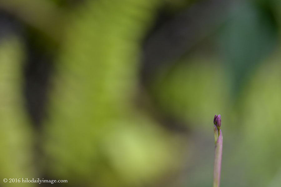 On my way out, I noticed this tiny bud (which I think will burst into many blossoms). I could barely make out detail with my old eyes and glasses, but I figured that the camera could. And it did. I adjusted the aperture to get the background the way I wanted it, which is to say with just a hint that those green objects are ferns.