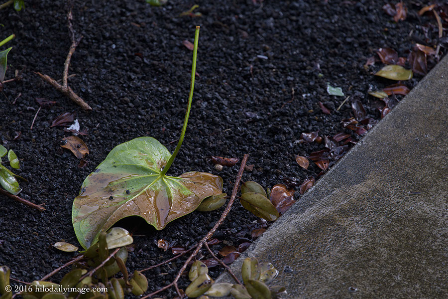 Backside of anthurium leaf, mossy walkway (must pressure wash) and some 'ohi'a trimmings. Cinders. Raining.