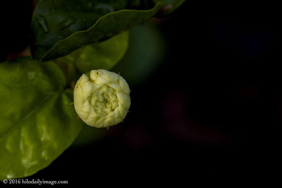 The Kula gardenia bush was looking very nice -- massed blossoms, but on the way out there this new rose pikake bud caught my eye. When buds, they are yellowish (here, the morning sun is helping out) but when mature, they are completely white.