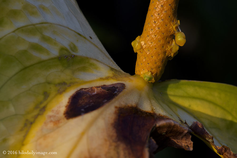 I think I've caught an anthurium doing its reproductive thing. I never gave any thought to how anthuriums reproduce -- seeds, runners, whatever. I haven't looked it up yet, either. But I think the yellowish objects on and just falling free from the spathe are the next generation of this anthurium.