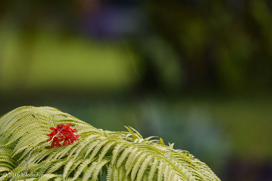Generally the "I'm headed straight for the sky" crimson epidendrum stands straight above the hapu'u frond. But this morning it seemed to be taking a nap.