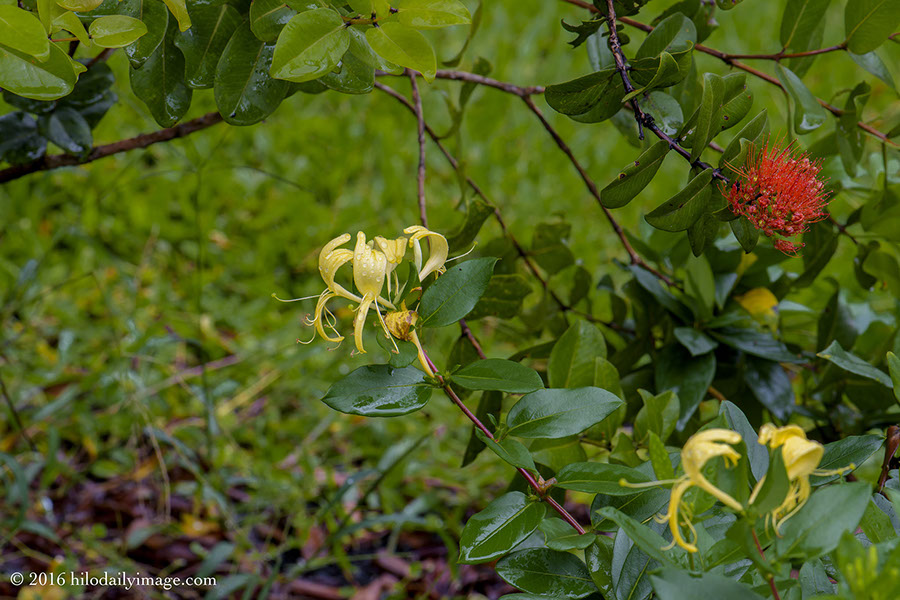 So, during a break in the rain, I went out to shoot one of the honeysuckles she planted in the early 1950s. It's still doing well, and has been in the HDI several times. This morning I coupled it with an orange o'hi'a blossom from a tree that I planted in 2014.