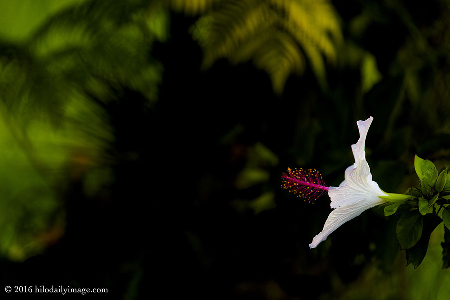 Then I saw a white hibiscus edge-on, which was nice, but even nicer was that the background was very dark, except for the hapu'u fronds.
