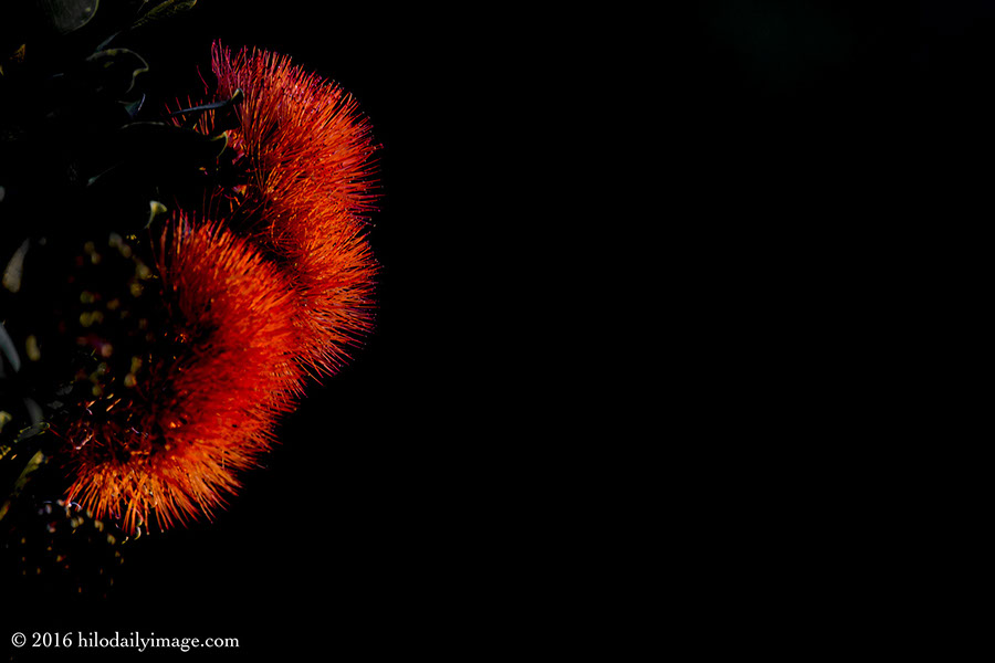 The rising sun lit up the orange 'ohi'a. Side view.