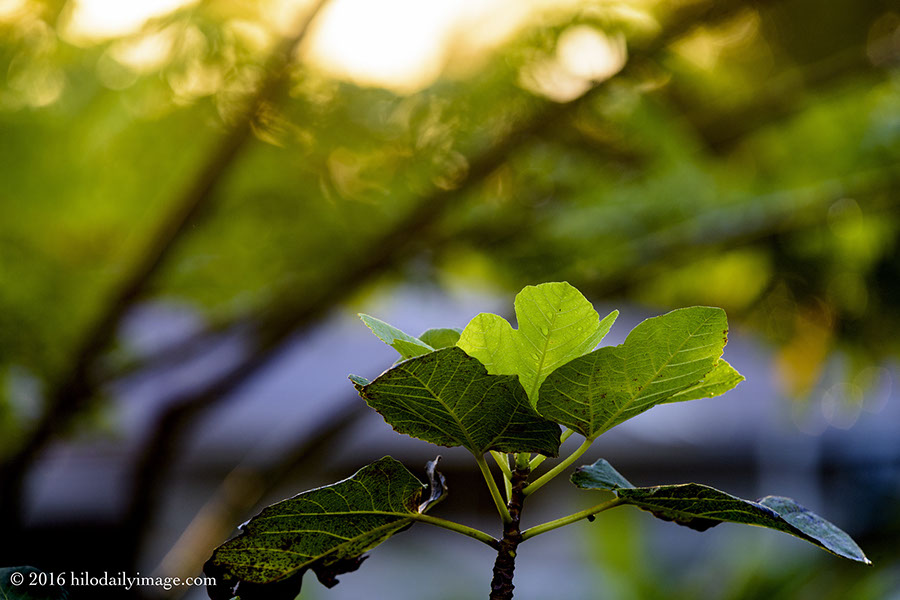 The top of the little Kadota fig tree, with the shower tree in the background. And the rising sun, of course.
