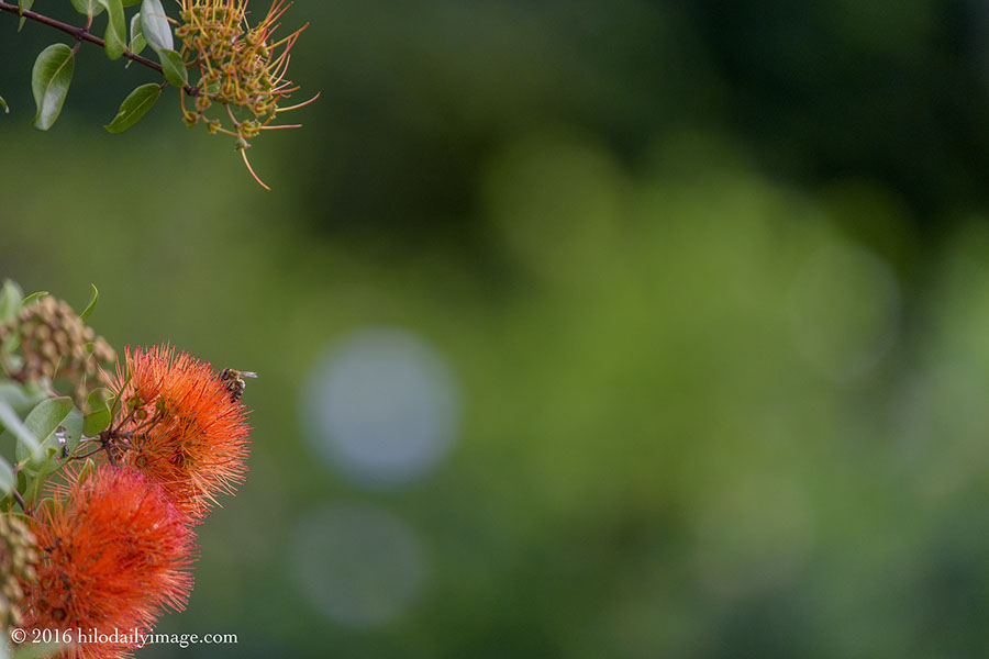 Bees like lehua pollen. I've never seen very many of them doing their thing on the orange 'ohi'a before, but these days they are very busy with it.