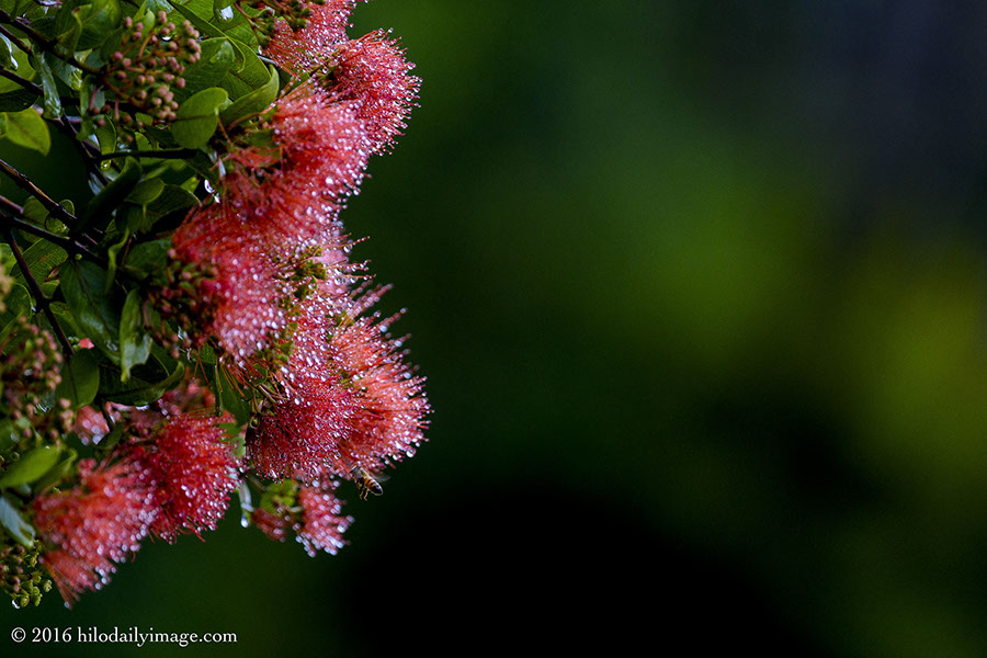 A while ago I mentioned that one of the orange 'ohi'a trees was going to have massed blossoms. It did, but the largest mass wasn't in a useful position for shooting. This morning, another mass, the blossoms still wet from the rain, was hit by the rising sun.