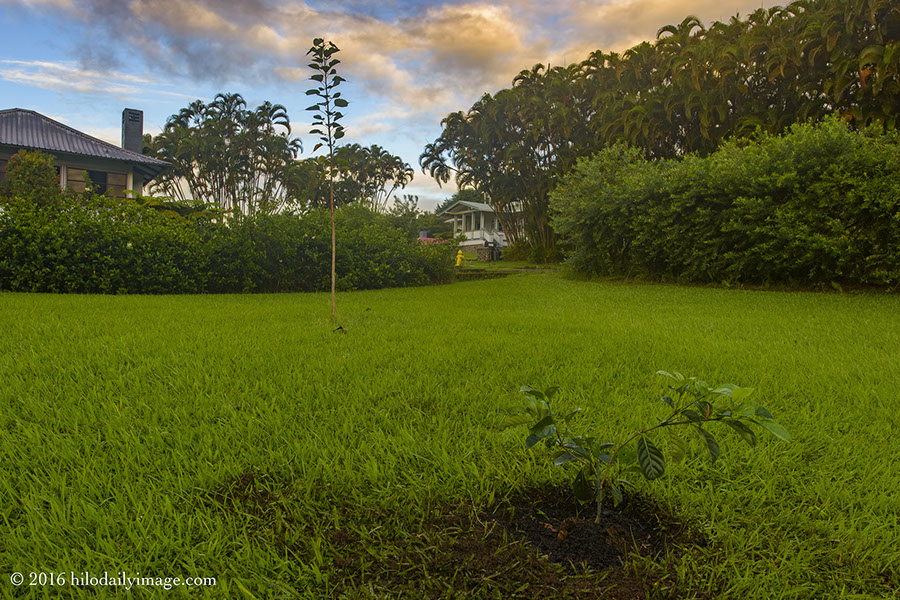 My grandson Sebastian's maternal grandmother Rhoda Holzer died on Wednesday. Her service was today, in New York, and so as the sun was coming up we planted a Kula gardenia in her honor, near Sebastian's Bohdi tree.