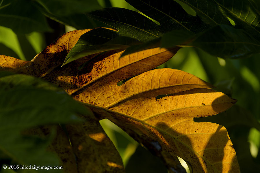 The breadfruit. I liked the yellow-brown among the greens, and I liked the greens in the out-of-focus areas more than the green of the leaves.