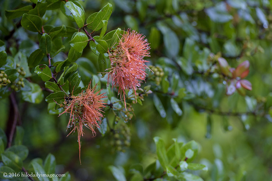 It rained hard all night. I went out on the front porch to look for something to shoot, and saw what must have been a wet bee checking out the wet orange 'ohi'a blossoms. I went back and got my fast telephoto, thinking that a wet bee would make for an interesting shot.