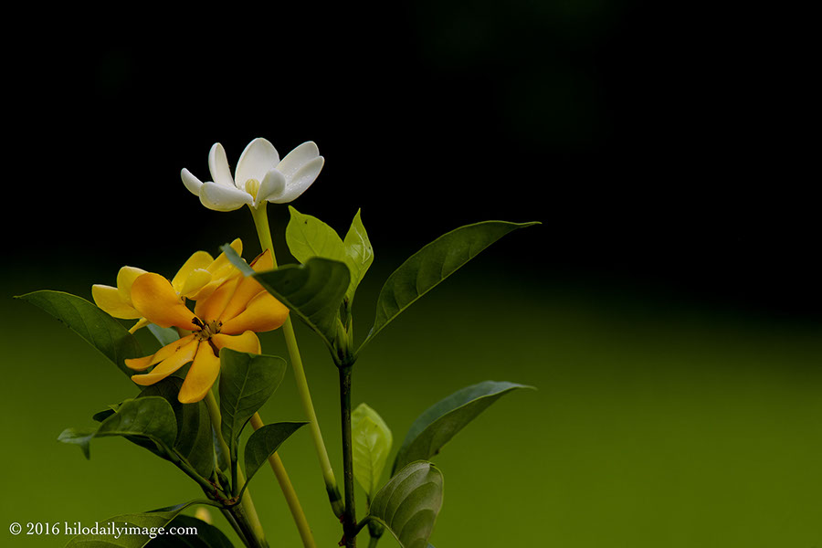 I wanted to "stack" the blossoms, so I used my 300 mm lens. And because I needed to get down very close to the ground (the tree's only about 18" high now) I used my beanbag support. I mention this because I think that in 757 Hilo Daily Image shots I've used the beanbag only one or two other times. My tripod can't go nearly as low as the beanbag can.