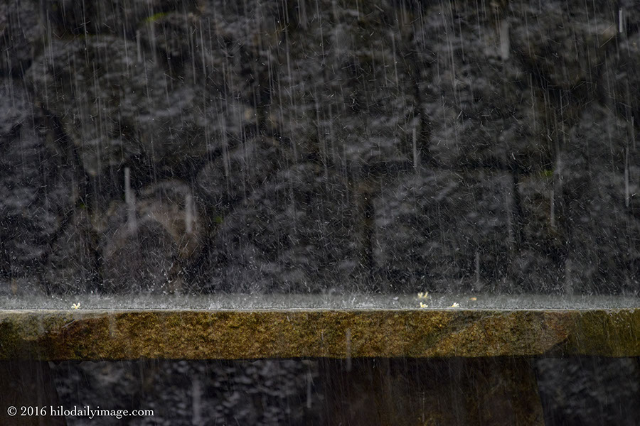 Here's the granite bench with a few kukui blossoms, the rock wall, and rain. And splashes.