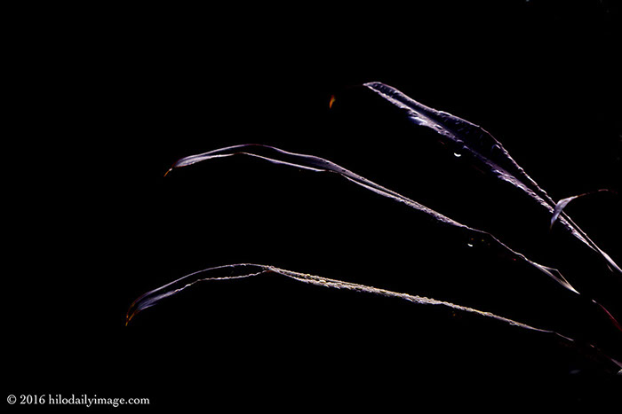 I went out on the porch earlier than usual, just to see what was happening, and saw that the raindrops on the black ti were being lit in an interesting way. So I went and got the camera, and underexposed the shot so that it would be easy to take down the blacks even more, leaving little but highlights and the orange/red at the tips.