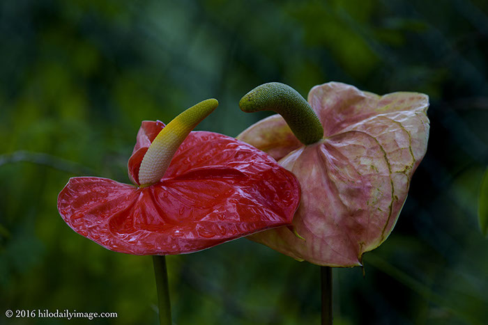 I tend to ignore the anthuriums in the back. They're not as brilliant and unusual as the newer varieties in the front bed. Although I'm not sure, the ones in the back may be several decades old -- maybe even 40 or 50 years old. I remember seeing them there when I was young, but that's not to say that these are literally the same ones. They could be, though. I'm choosing to believe that they are.