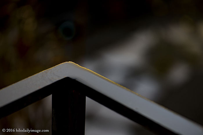 When I went outside to see what was happening, I noticed the low yellowish rising sun was laying down a thin reflection on the porch railing.