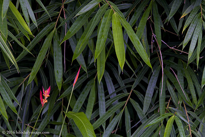 There was a very nice drooping betel palm frond, so I went out with a long lens. But it wasn't as interesting as I'd hoped. The combination of light bamboo leaves / dark bamboo leaves / shadows / bright flowers caught my eye, and here it is.