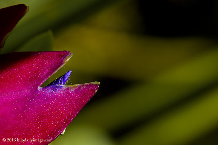 I offered this bromiliad not long ago. It puts out little purple tongues. It made one last week, but it fell off before I could get to it, and my attempt to capture it lying on the gravel didn't work. So here's another purple tongue just getting started.