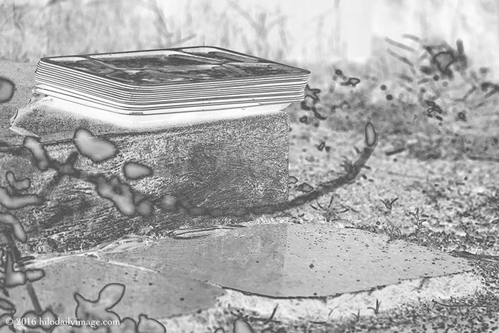 A pile of metal lunch trays in the Zen garden, in the rain. I found them under the house earlier in the week. I have no idea how they came to be there (under the house, I mean; I know perfectly well why they're on the steps). I feel confident that my mother never intended to open a cafeteria or preschool on Wailuku Drive, or to operate a soup kitchen. So, shrouded in mystery and therefore worthy of contemplation.