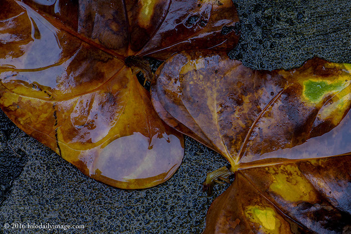 Here are anthurium leaves on concrete, with the usual rain pools.