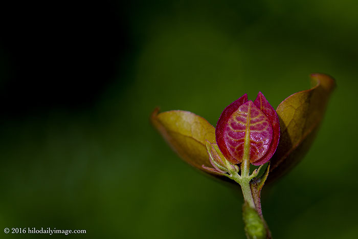 Early-stage Bougainvillea bract. And yes, for once not early morning. That's actual sunlight you see reflected there.