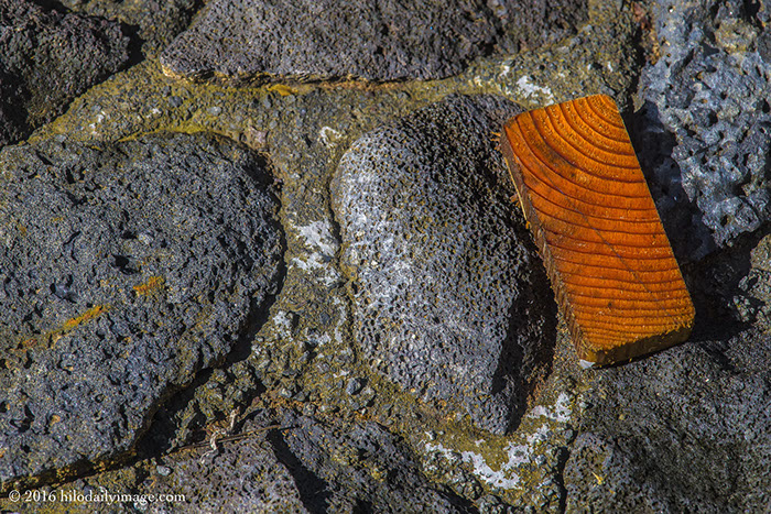 Top of the rock wall, wood scrap. I was shooting the Surinam cherry, but it was boring. I liked the contrast between the wood and the lava, plus the little bit of color on the lava. This is looking down on the area that's been the woodshop for almost a year now. Even all the rain we've had doesn't quite get rid of the accumulated sawdust. Which is OK by me.