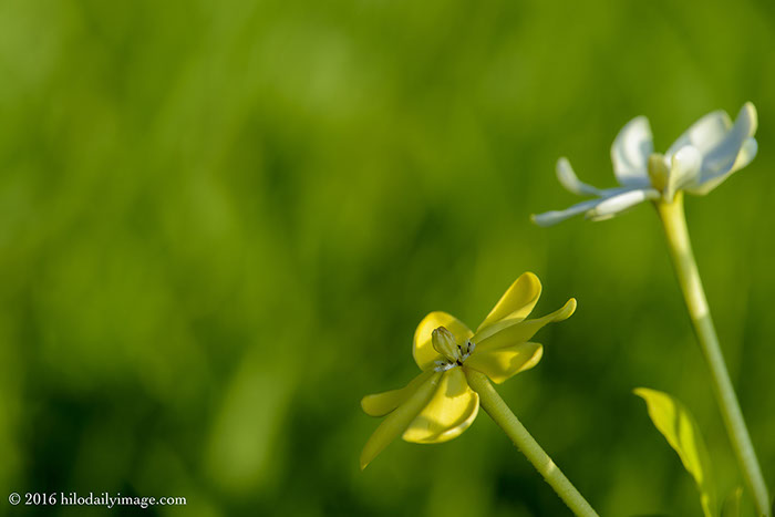 This is the same Kula gardenia -- Rhoda's -- that yesterday was white with yellow highlights. Today it's fully yellow, and will begin darkening.