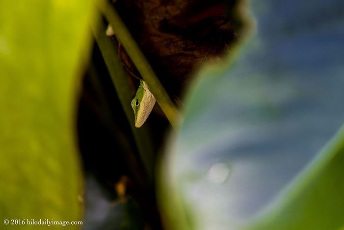 I was shooting Rhoda's Kula gardenia, and on the way back in I saw this lizard hiding in the anthurium bed. I suppose it's checking me out as much as it's hiding.