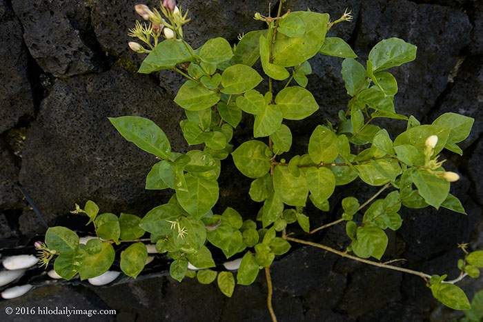 Pikake, lava rock wall, Zen sculpture with stones, slug, and cable tie. That's how we roll in Hilo.