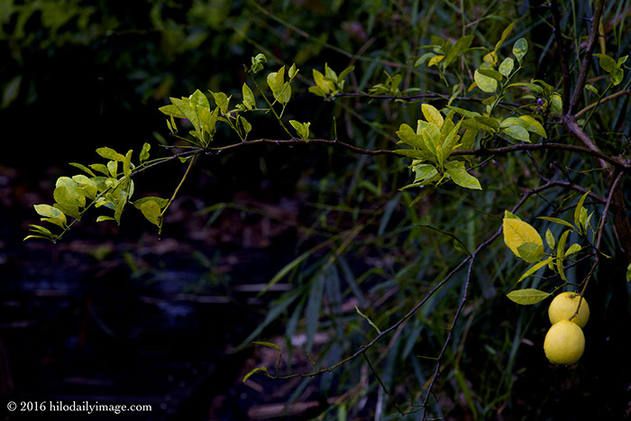 Dark, raining, and nasty on Wailuku Drive this morning. Here's the Meyer lemon tree with a pair of happy yellow lemons, and a nicely-arching branch.