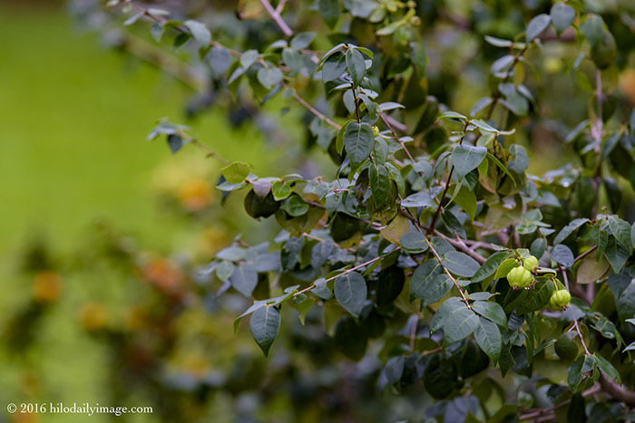 Still wet and dark. I like the green/yellow, almost day-glo color of immature Surinam cherries. In the background, orange kumquats.