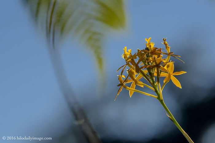 Some good sun this morning. Here's a yellow epidendrum with a hapu'u frond.