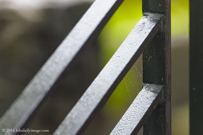 I shouldn't bother typing "rainy, dull, windy," because by now that's a familiar theme. So here's the railing, with spider web, insects, and water -- but no spider that I can see.