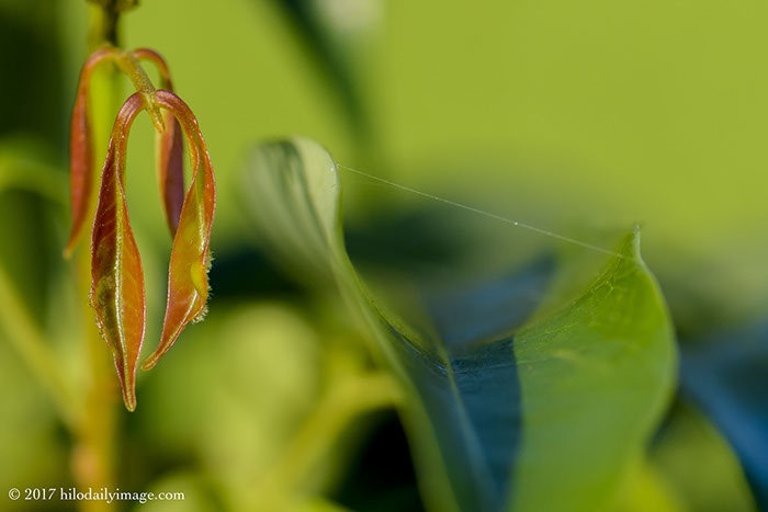 A pair of new leaves on Raine's lichee. Plus spiderweb. And sun.