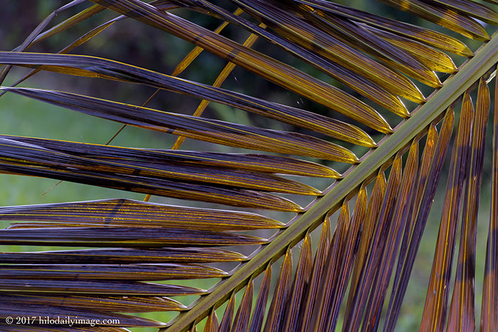 This Areca frond fell on one of the kukui trees, and stayed there. I liked the shape, but as I was shooting it, the sun came out and I liked the play of light on the frond better than its shape. So here it is, with some spiderwebbing too.