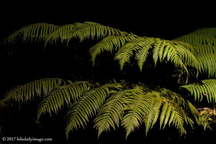 The usual Sunday pre-sunrise shot. This time I noticed that the hapu'u fronds near the security light made interesting horizontal shapes, with a nicely-dark background.